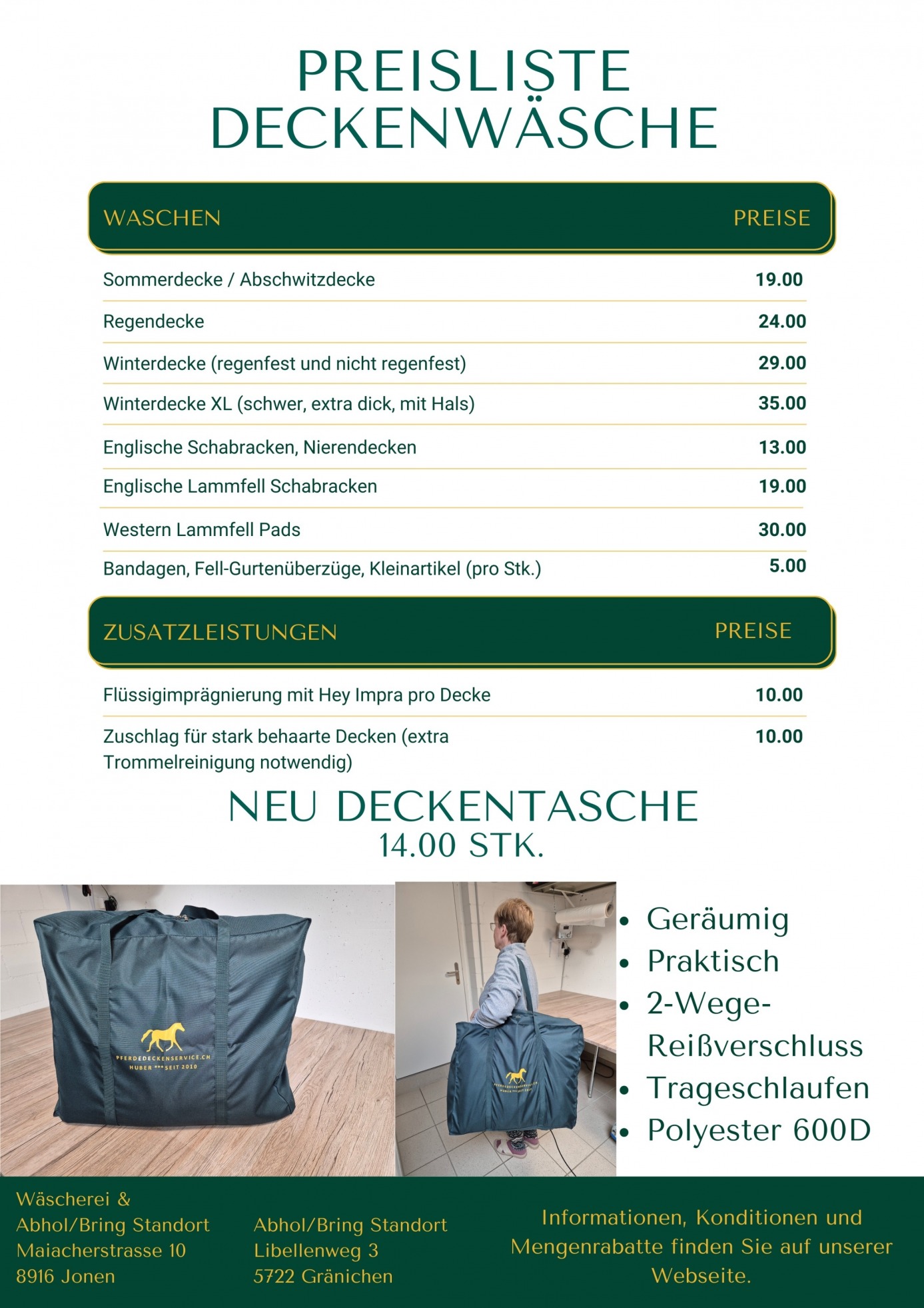 Wir können keine Haftung für uns anvertraute Decken übernehmen. Bei der Wäsche wird jedoch grösstmögliche Sorgfalt angewendet. So werden z.B. alle Schnallen aufwändig eingepackt. Unsere Miele Professional Waschmaschine ist extra für die Pferdedeckenwäsche konzipiert.